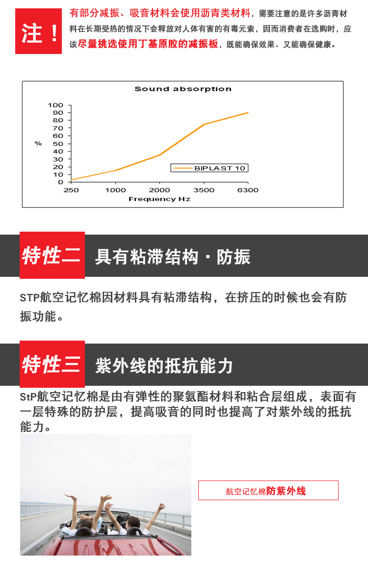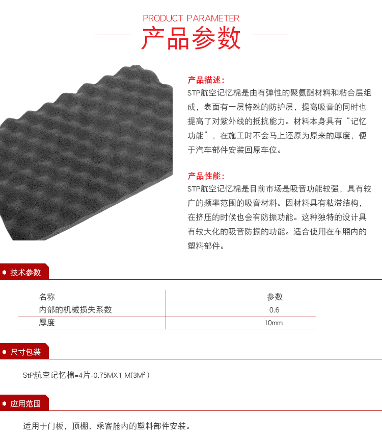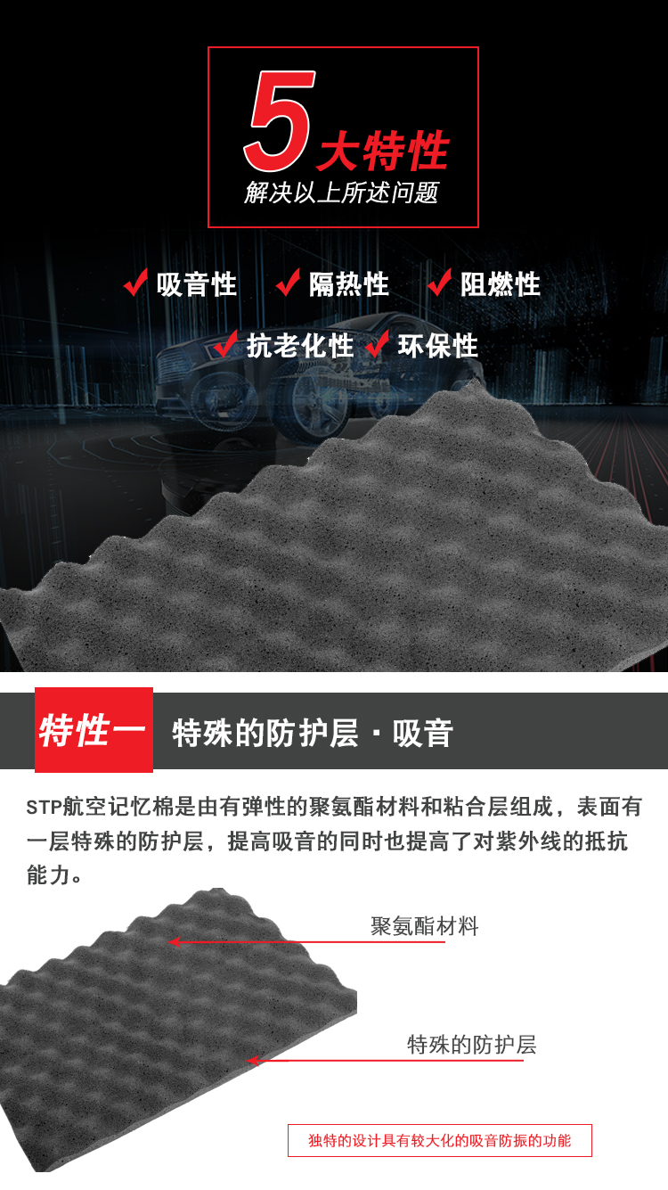 STP航空記憶棉是由有彈性的聚氨酯材料和粘合層組成,表面有一層特殊的防護(hù)層,提高吸音的同時(shí)也提高了對(duì)紫外線的抵抗能力。材料本省