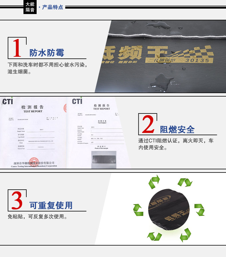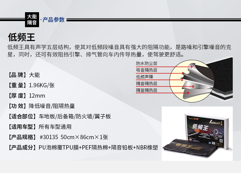 大能低頻王具有聲學(xué)的五層結(jié)構(gòu),對低頻噪音有非常明顯的阻隔作用,有效阻擋排氣管,引擎蓋向車內(nèi)傳導(dǎo)的熱量。