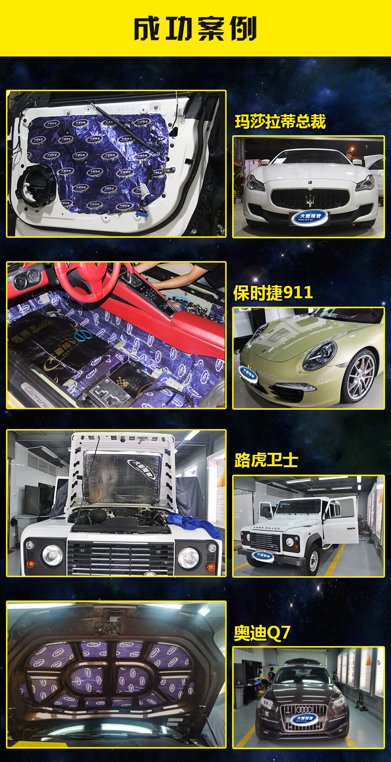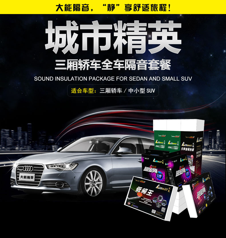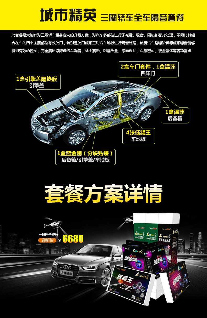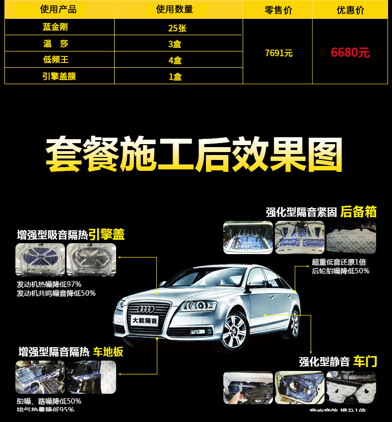 大能6680元加強城市精英全車隔音套餐材料配置:藍金剛25張、低頻王4盒、溫莎3盒、引擎蓋膜1盒,此配置在降噪減震的基礎(chǔ)上針對路噪增加了大能的低頻王對路面噪音進行加強處理,效果明顯。
