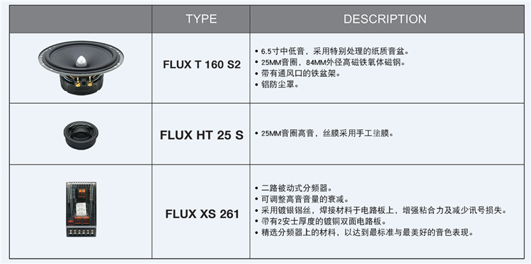 FLUX SC 261的高音單元型號為HT 25 S,使用了高磁性的釹磁體,以及涂覆了加強液的絲質(zhì)凸球頂軟振膜。這是非常成熟的設(shè)計。可使所還原的聲音在清晰細致的同時具有柔和優(yōu)美的特性。FLUX SC 261的分音器型號為XS 261,所使用的電感、電容和電阻看似普通卻經(jīng)過精心的篩選和配對,所附設(shè)的大型鍍金跳線器更可方便改裝技師根據(jù)車內(nèi)的實際聲學(xué)條件而對高音量感作出適當?shù)恼{(diào)整。