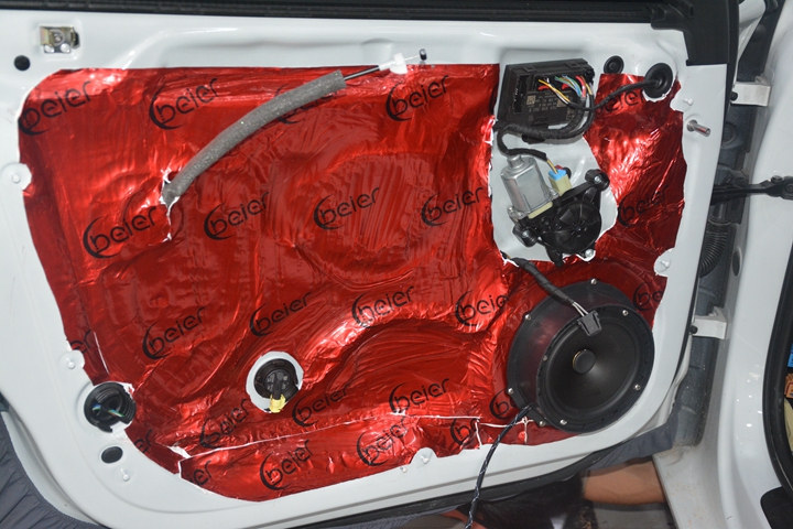 2.通過(guò)隔音、減振材料對(duì)汽車進(jìn)行減振及隔音處理,降低汽車鈑金結(jié)構(gòu)傳遞的噪音,提高駕駛舒適度。對(duì)門(mén)板隔音, 車門(mén)的隔音處理里外雙層要貼上的隔音材料,在車門(mén)的兩層鋼板上分別貼上一層頂級(jí)隔音材料,可以起到良好的隔音、制振、密封的多重作用,封閉的車門(mén)腔為喇叭提供了一個(gè)音箱箱體,使喇叭的性能得到充分發(fā)揮,尤其對(duì)改善聲場(chǎng)的中低頻效果作用巨大.