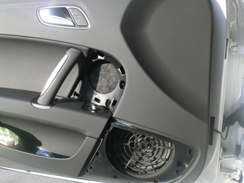 作為血統(tǒng)純正的跑車,奧迪TT給人耳目一新的感覺:線條緊致,幾何圖形的設(shè)計以及強勁的動力,不論到哪里,都是拉風的范!TT嬌小的車身,前車門預(yù)留有中音喇叭的位置,還有一對6,5寸喇叭的位置。這臺TT的音響改裝,毫無疑問,引起了大家的關(guān)注。