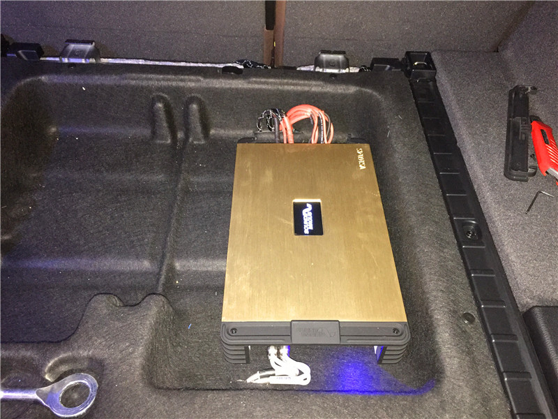 一臺(tái)四路功放裝尾箱,該款功放功率大,在4歐姆的負(fù)載條件下,每聲道可以輸出160W的功率,其設(shè)計(jì)四路是專門針對(duì)高檔的音響系統(tǒng)改裝,功能較多,聲音柔和悅耳,背景清晰,是一款性價(jià)比比較高的功放。此系統(tǒng)是兩路推中高音,兩路推低音。
