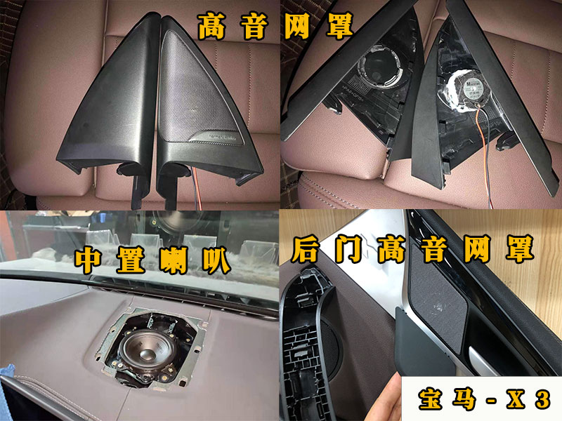 這里用到的高音網(wǎng)罩都是原廠的高配網(wǎng)罩。低配的寶馬X3角位那里是沒有高音喇叭的,升級(jí)后才有網(wǎng)罩和高音喇叭!后門加裝的高音喇叭也是同樣的道理,都是更換了新的網(wǎng)罩。