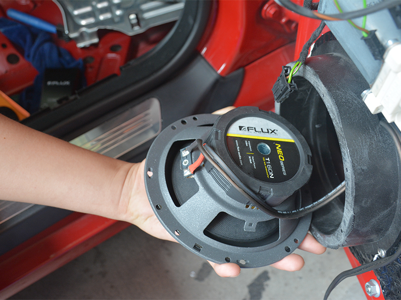 喇叭的安裝是非常的嚴(yán)謹(jǐn)?shù)模t色和黑色的位置處,使用最好的絕緣熱縮管套緊,不但是為了好看,更是為了安全防止短路。非常重要部位