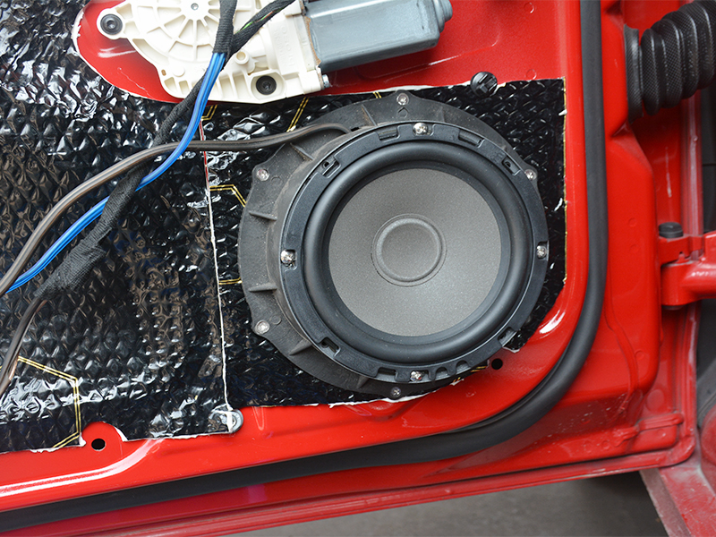 拆卸后門板的原車隔音,是一層薄薄的泡沫紙。起不了隔音效果,只有防水的作用