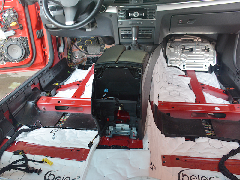 【原車隔音分析】:原車的隔音其實都比其他的同系列的車款要好,但是原車隔音材料屬于瀝青隔音。隨著時間的延長發(fā)揮出對身體有害的味道。所以車主選擇整車跟換貝爾綠色環(huán)保的隔音材料