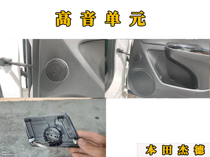 本田杰德全車有四個(gè)高音單元!分別在四個(gè)門板上面,前門可以直接安裝,后門的則需要使用卡扣和AB膠來固定