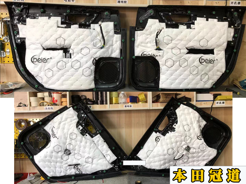 四門隔音是三層,使用的材料是貝爾的藍(lán)膜止震板和貝爾的吸音棉。第一層隔音是貼在內(nèi)壁,增加鋁板的的厚度,減少共振和高速行駛中的風(fēng)噪,也能提供相對(duì)較好的車內(nèi)環(huán)境。