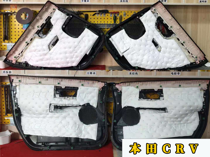 第二層隔音和喇叭的安裝。第二層隔音是密封整個(gè)車門的,一樣是提供好的音響環(huán)境。還可以制造音箱。貼好第二層隔音之后就可以安裝喇叭了,在原來(lái)的位置換上一個(gè)本田CRV的專用喇叭墊。就可以直接把喇叭安裝上去了,無(wú)損的,沒(méi)有開(kāi)孔也沒(méi)有打洞。外面的那一層是防水罩。
