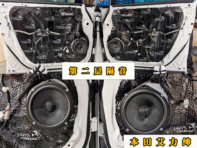 首先看到的是四個(gè)門板的三層隔音和門板中低音的安裝。門板的三層隔音使用的是兩層止震板和一層吸音棉。主要功效是第一層止震減少異響,第二層密封車門提供好的傳播環(huán)境,第三層是降噪,減少高頻噪音,不管是車內(nèi)還是車外。