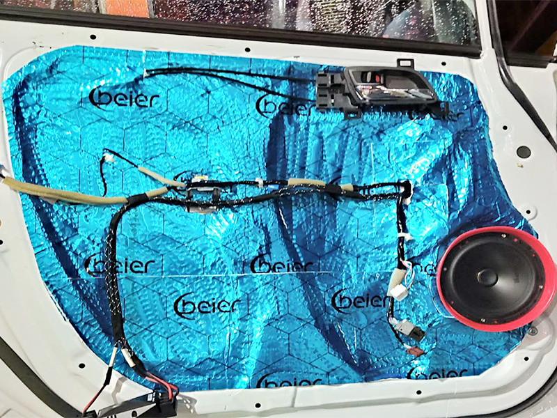 使用貝爾藍(lán)膜一整塊的隔音代替原車的防水膜加強(qiáng)原車的門板防水功能同時大幅度提升音質(zhì)效果
