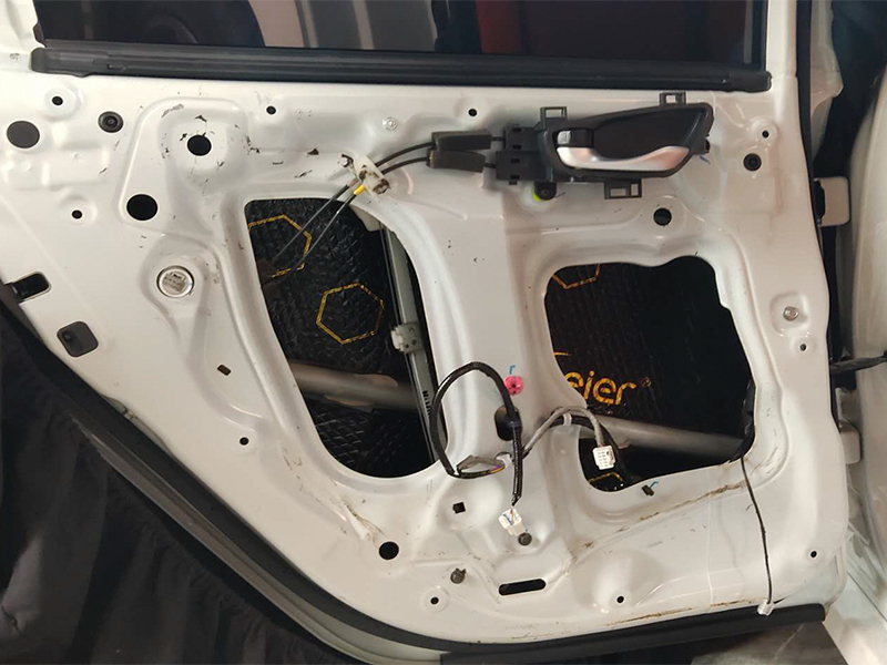 日系車原車門板內(nèi)部結(jié)構(gòu)基本都是一樣,靠一張膠膜防水,沒有任何的隔音材料