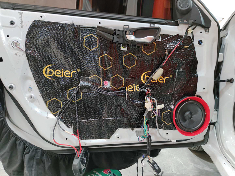 經(jīng)過改裝師傅專業(yè)的清理之后,對(duì)第一層鈑金進(jìn)行隔音處理,加厚鐵皮減少共振