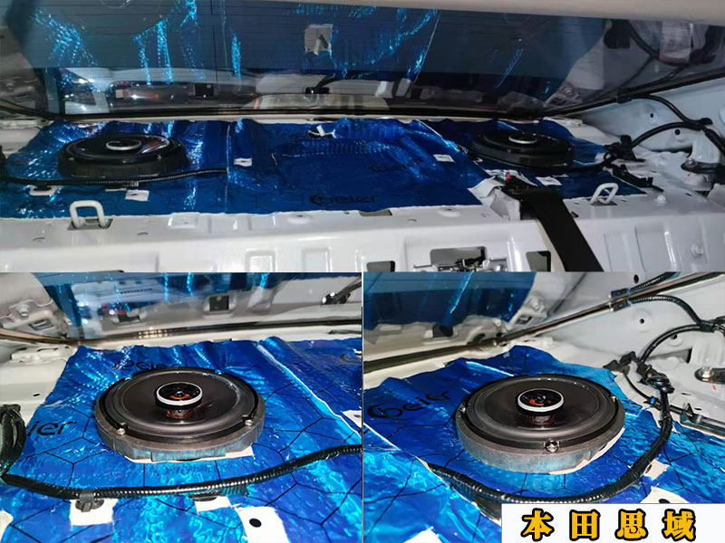 第二層隔音是密封的作用,思域的后門是不配備喇叭的,兩個(gè)中低音轉(zhuǎn)到了后平臺(tái),這次給升級(jí)為JBL的同軸喇叭,當(dāng)然也要貼上一個(gè)隔音來防止共振。喇叭的安裝都是原安裝位和專用的喇叭墊和喇叭防水罩。
