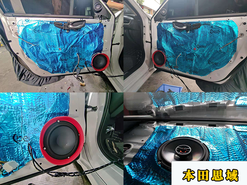 先簡單看一下配置,升級的是四門喇叭和加裝一個處理器,前門升級的是6500的套裝喇叭,包括兩個中低音兩個高音、兩個分頻器。思域的后門是沒有喇叭的,喇叭被轉(zhuǎn)移到了后平臺上。升級的是兩個同軸喇叭!并且還加裝了一臺處理器來進行調(diào)音。隔音用的是貝爾的藍膜。
