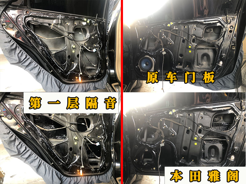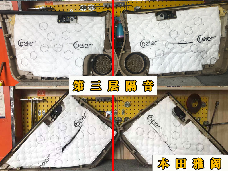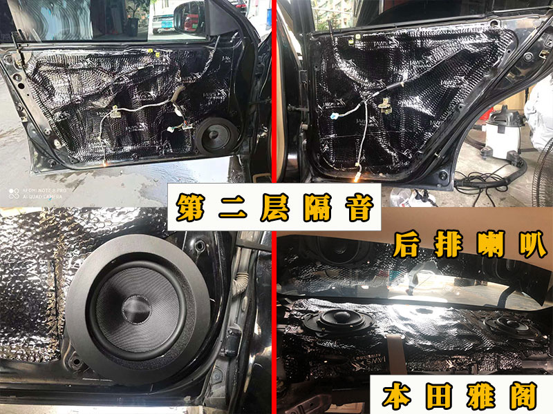 現(xiàn)在看到的是第二層隔音,第二層隔音是密封作用。就是制造箱體,讓音質(zhì)更好一點。畢竟喇叭如果沒有箱體的話和在菜市場放是沒啥區(qū)別的。音質(zhì)不聚集很散。雅閣的后門是沒有喇叭的,但為了音質(zhì)效果也做了隔音,兩個同軸喇叭安裝在后平臺上面了。