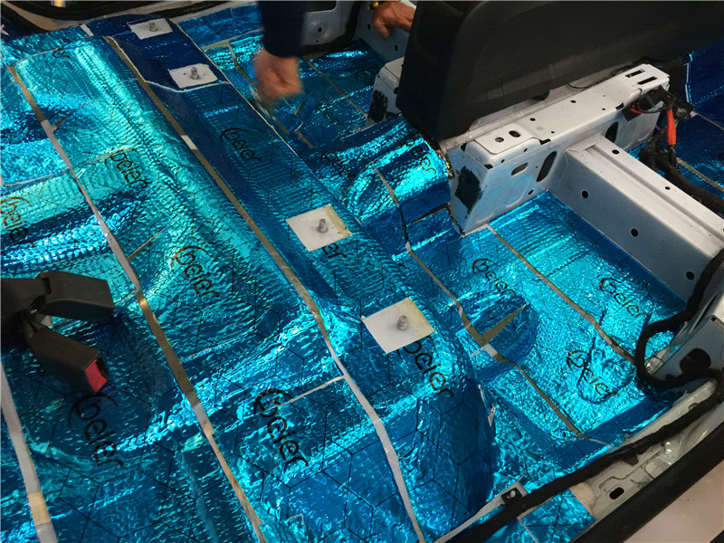 首先用減震板進(jìn)行止震處理,提高底盤的剛性,減少共振產(chǎn)生噪音;再貼一層吸音棉,除了吸音效果外,提高了底盤的密閉性,隔音效果自然更加好。