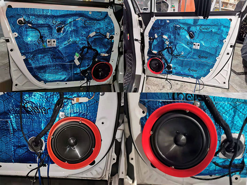 我們都知道,原車(chē)的門(mén)板厚度是比較薄的,行駛過(guò)程中容易產(chǎn)生共振,風(fēng)噪也是挺大的,這樣的環(huán)境您覺(jué)得聽(tīng)音樂(lè)音質(zhì)還會(huì)好嗎。所以我們首先要把四門(mén)隔音給做好,這里門(mén)板是做了兩層隔音的,第一層實(shí)在門(mén)板的內(nèi)部(師傅忘拍照了),第二層是在外圍,這樣就可以形成箱體,減少車(chē)門(mén)的共振和降低風(fēng)噪的同時(shí),也能有一個(gè)相對(duì)較好的車(chē)內(nèi)環(huán)境。