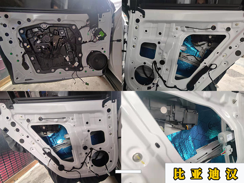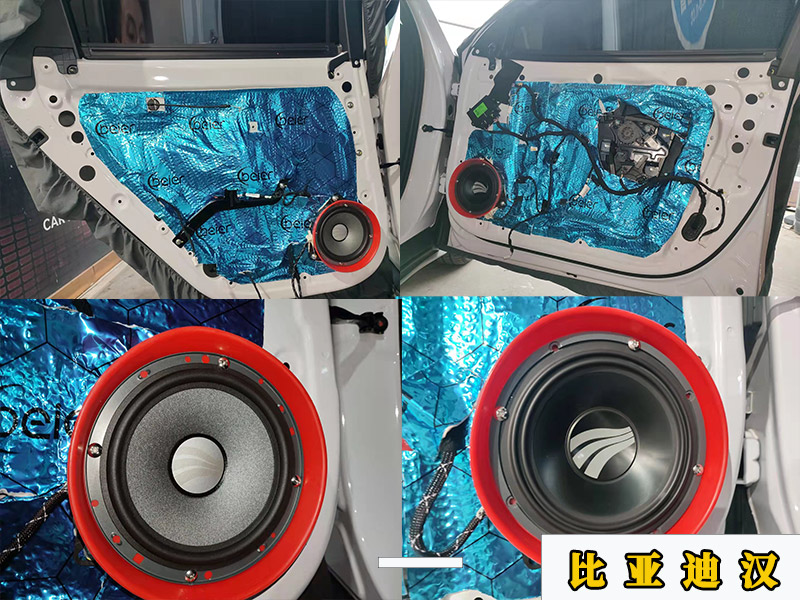 第二層隔音和喇叭的安裝,門板的第二層隔音可以密封,讓門板變成一個(gè)簡(jiǎn)易的箱體。很大一部風(fēng)車型原車的門板隔音是幾乎沒(méi)有隔音效果的。然后喇叭安裝這里,需要更換比亞迪漢的專用喇叭墊,這樣才可以無(wú)損的把喇叭裝上去,外面套上去的是一個(gè)防水罩。