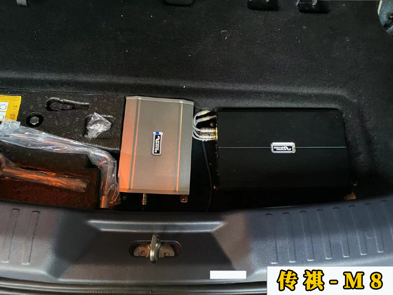 首先是前后的喇叭全部升級為JBL的600C,儀表臺(tái)的中置也更換了,后尾箱裝了一個(gè)定制箱體的10寸低音炮,前后聲場的喇叭用兩臺(tái)圣美歌的功放來推,處理器裝的是阿爾派的R600.然后四門隔音是貝爾的黑金剛黑膜。