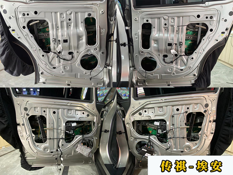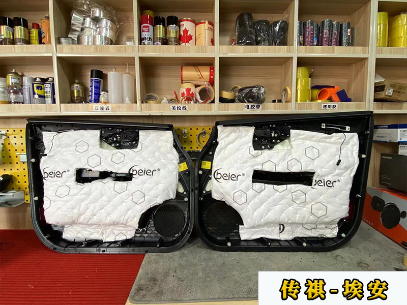 隔音是三層的,用到的材料是大能的綠膜,這里是第一層隔音,主要是可以增加門板的厚度,減少門板的共振,同時(shí)也可以降低風(fēng)噪。