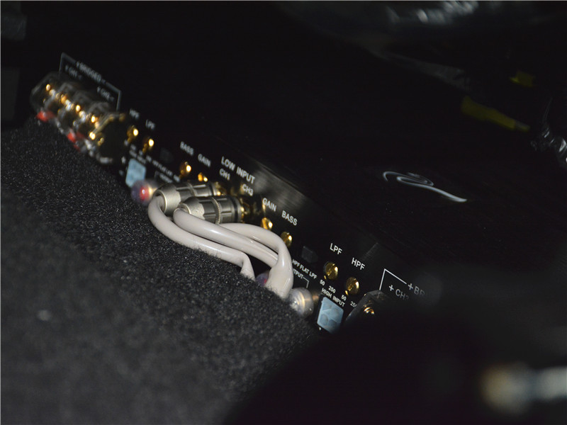 惠威X3 A/B類四路功放安裝在副駕座椅下,能有效機(jī)器的散熱和隱蔽