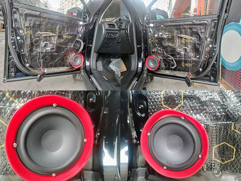 上面兩張圖是第二層隔音貼完之后的效果,還有就是喇叭的安裝效果圖,第二層隔音就不多說了,主要是在喇叭的安裝上,我們使用的都是專車專用的喇叭墊,是完全復(fù)合原車安裝位的。紅色的外層是喇叭防水罩。是用來防止雨天雨水滲進(jìn)門板里面對喇叭造成損壞。