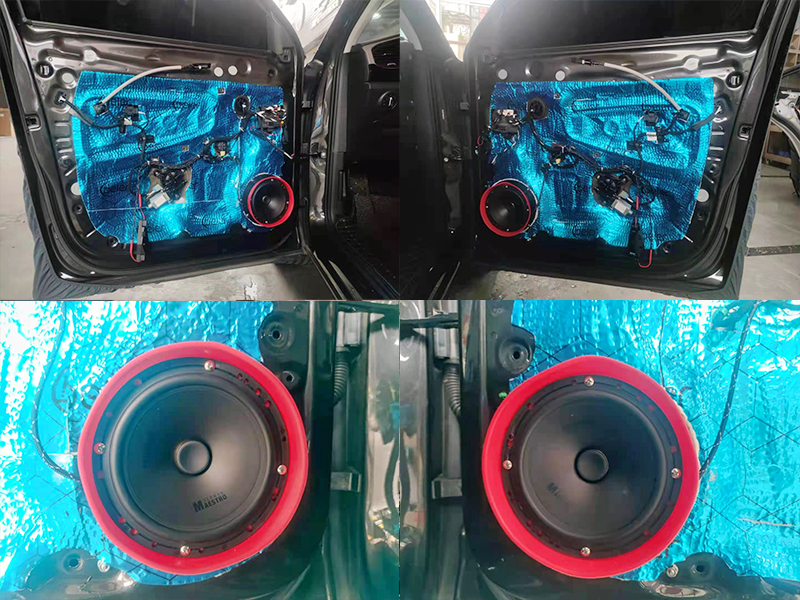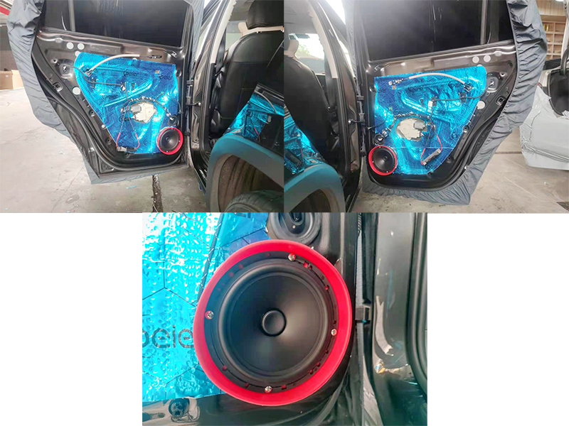 貝爾的隔音藍膜也是我們這里使用最頻繁的一種隔音材料,隔音效果也是沒得說,總體而言,減震和減少異響的效果還是挺明顯的,畢竟如果隔音不好的話,再好的喇叭也發(fā)揮不出它的性能。上圖展示的是第二層隔音完成之后的效果,也安裝完成了喇叭!這邊喇叭的安裝是更換喇叭墊、焊線、套喇叭防水罩、螺絲固定等步驟,全程無損安裝。不用擔(dān)心會對您的愛車造成損耗哦!