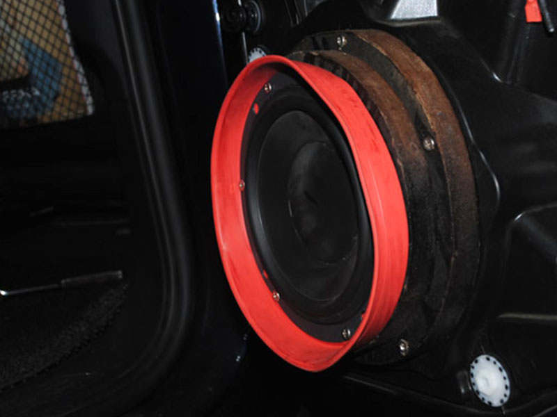 門上丹拿喇叭裝好,除了用上德樂專利產(chǎn)品--紅色防水墊圈之外,其他細節(jié)的地方,也處理得很仔細。2層厚的喇叭墊圈工整穩(wěn)定的裝在門板上,線路布置也非常簡潔