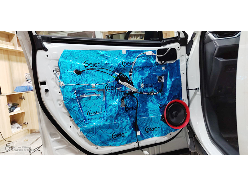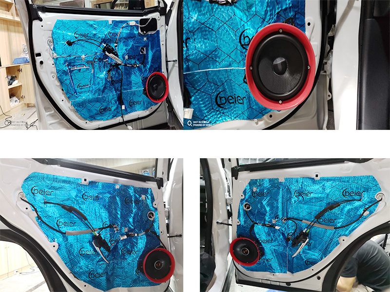 四門使用貝爾藍膜三層隔音,汽車第一第二兩層使用貝爾減震板減少共振提升音質(zhì)效果