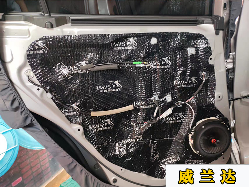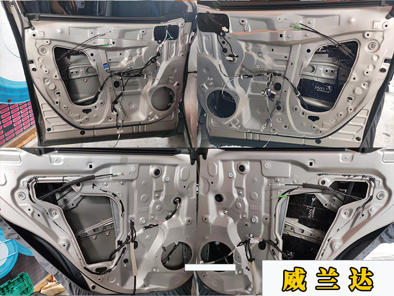 威蘭達(dá)和漢蘭達(dá)都是改得比較多的車型,拆裝方面也是比較熟悉。先簡單看一下這一個(gè)配置,全套一共是6個(gè)喇叭,前門4個(gè)后門兩個(gè)同軸。加上一個(gè)JBL的新款DSP。門板隔音也是按照慣例做了三層