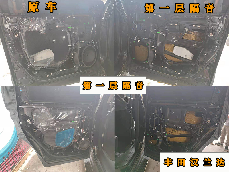 前門們的原車門板和做了隔音之后的對比。左邊是原車,右邊是做了第一層隔音的。門板隔音一共有三層的。第一層是增加門板厚度,減少共振和風噪。減少噪音的同時也能提供更好的車內(nèi)環(huán)境來提升音質(zhì)效果。