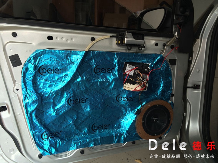 車門外層減震板主要是減震密封,提升音響效果。粘貼時根據車門的門板尺寸剪裁的,反復擠壓粘上的隔音材料,使之與鋼板緊密貼合!