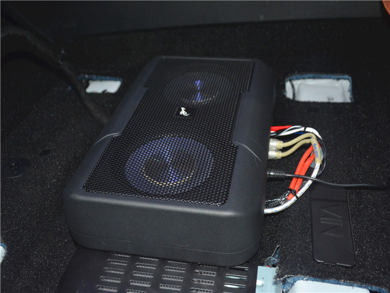 惠威V6 8寸小鋼炮裝在座椅下方不但隱蔽而且離儀表臺(tái)距離近低音效果更好發(fā)揮