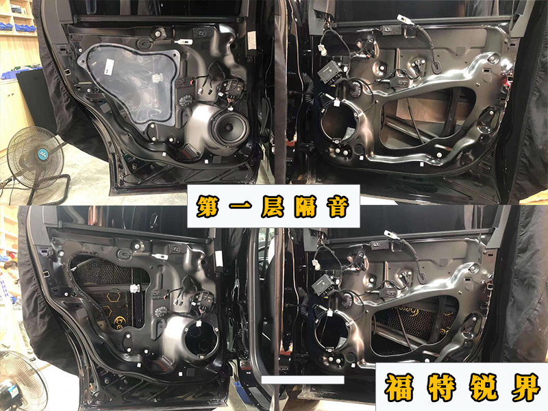 這里來看一下四門的隔音,上面是原車的一個門板,僅僅只有一層防水而已,真的很薄下圖是做了第一層隔音的,可以看到第一層隔音是貼在內(nèi)壁的。通過增加門板的厚度來減少風(fēng)噪和共振。