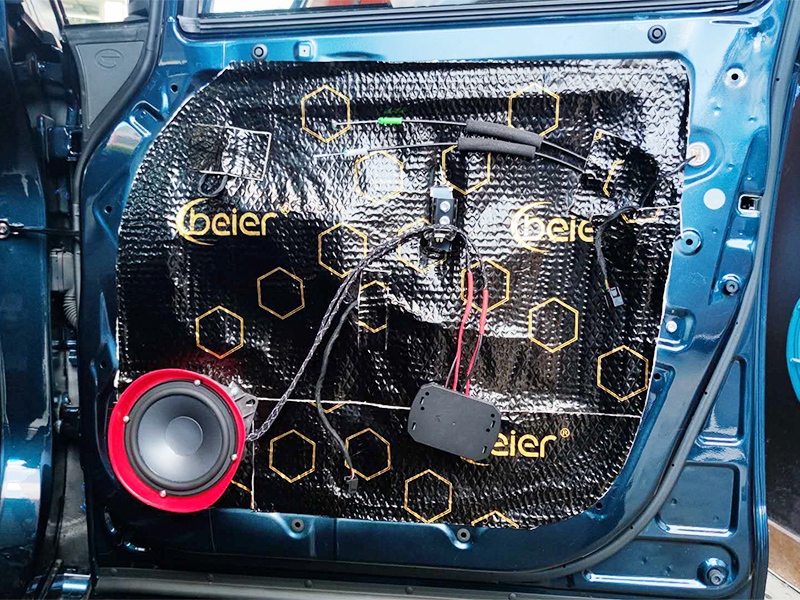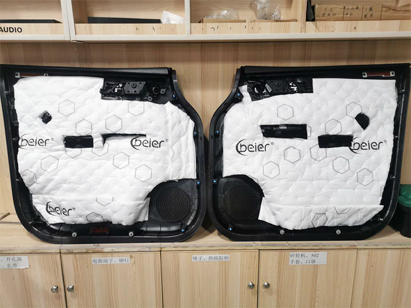 原車門板是喇叭發(fā)音的重要發(fā)聲體,所以全套貝爾黑金剛隔音上馬