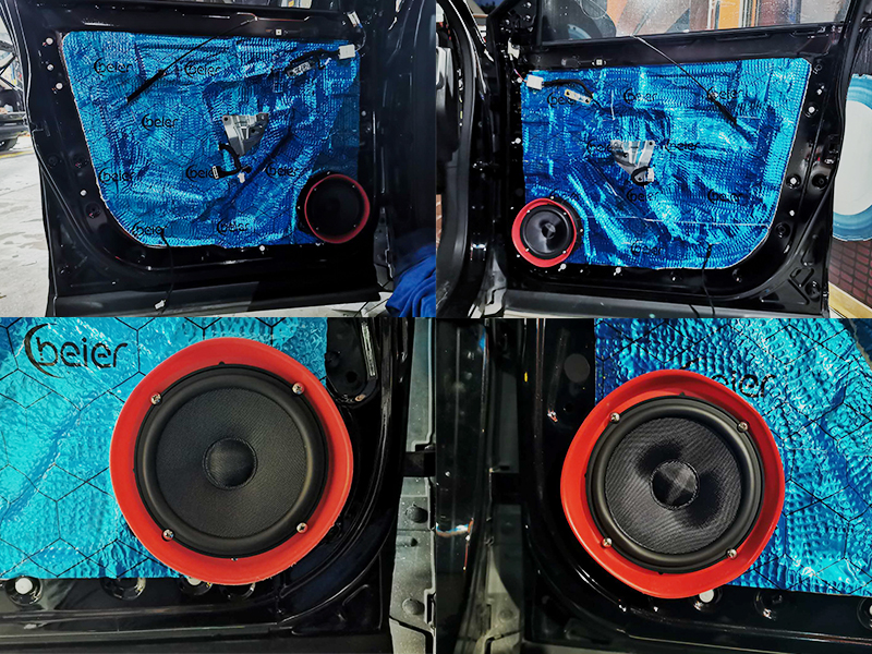 第二步是拆掉原車的喇叭安裝新的。再使用貝爾的隔音藍(lán)膜制造密封層。密封能使聲音的回響做到最少的丟失。隔音效果也更好。