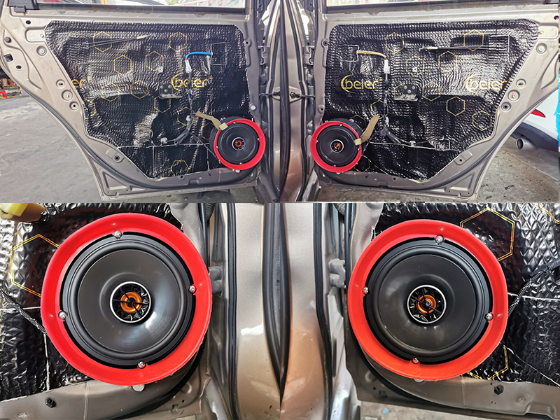 第二步是做車門的密封。使用的依舊是黑金剛的隔音膜。這里我們用的都是專車專用的配件。直接在原車的基礎上進行更換,而不是改造。紅色的外圈是我們店里的專利產(chǎn)品。麗音喇叭罩。他能很好的保護喇叭,延長使用壽命。