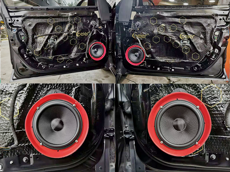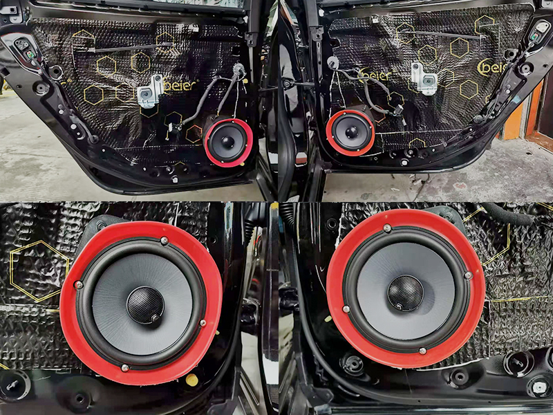 原車的隔音一般都不是很好,起因就是車門的鋁板比較薄。容易引起共振造成音質(zhì)損壞個隔音不好。首先我們就得升級一下隔音。黏貼式的貝爾隔音黑膜,不傷車不脫落。