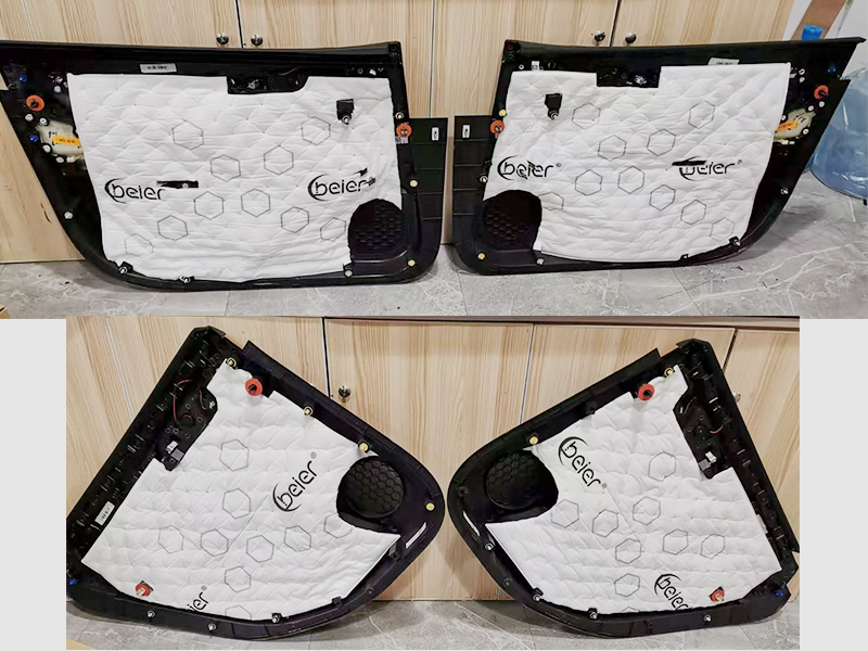 上面的一些安裝細節(jié)你們也可以看到,喇叭上我們還加了防水罩的。那么接下來我們要做車門的外層隔音,也就是使用厚的吸音棉。這也是黏貼式的。也相對厚實,吸音效果還是可以的。
