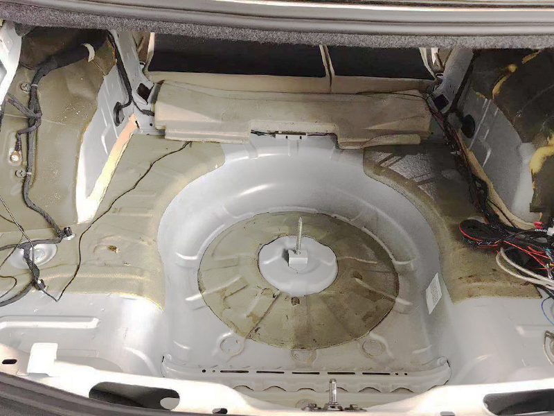接下是尾箱隔音,尾箱在的鈑金也是屬于薄弱的一個地方,容易發(fā)出高頻雜音,所以第一步必須需要加強(qiáng)鈑金厚度(拆卸后原車的瀝青隔音,最好清理掉,因?yàn)榇蠹乙仓罏r青發(fā)出的異味,有毒對身體有害,所以鏟掉是最好的)