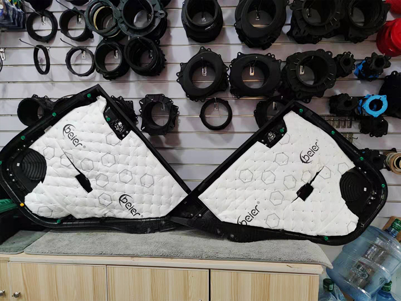 上圖是喇叭安裝完成后的,隔音我們用的是相對來說更厚,效果更佳的黑膜,一共是兩層,里面一層外面一層,形成了一個箱體。前門裝的是中低音喇叭,后門換的是同軸喇叭,同軸喇叭上面的那個圓圈就是高音單元,就是說整個喇叭就包括了中低高三種音質(zhì)。是不需要再加裝高音的。