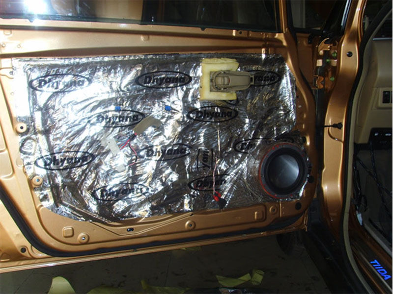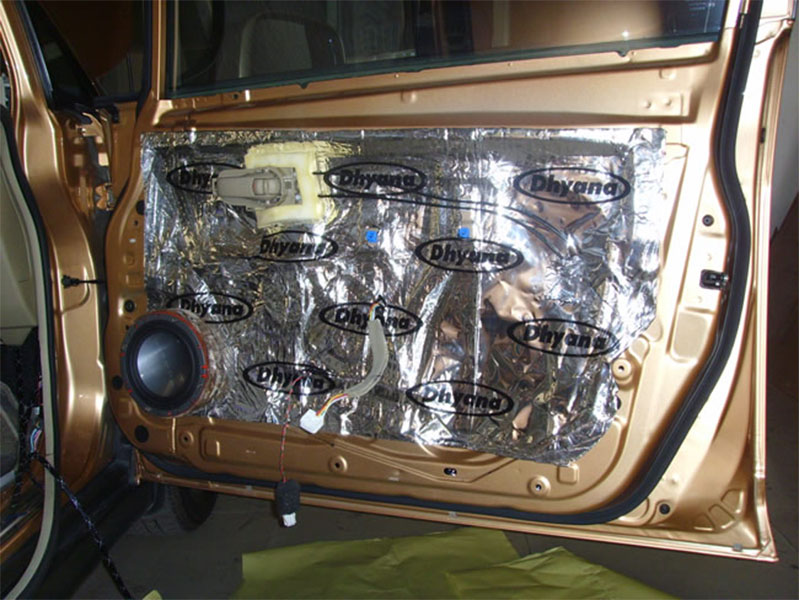 四門隔音:主要是用大能隔音王8張,施工部位里外各一張.主要2:把車門形造成一個(gè)音箱的作用.
