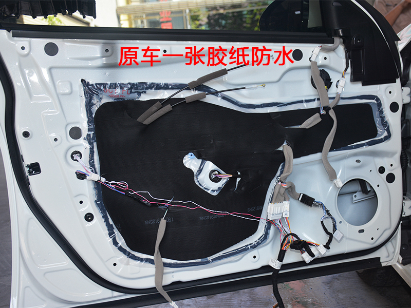 拆開門板,原車前后門板只有單薄的塑料防水層,起不到隔音的作用,而且容易產(chǎn)生異響