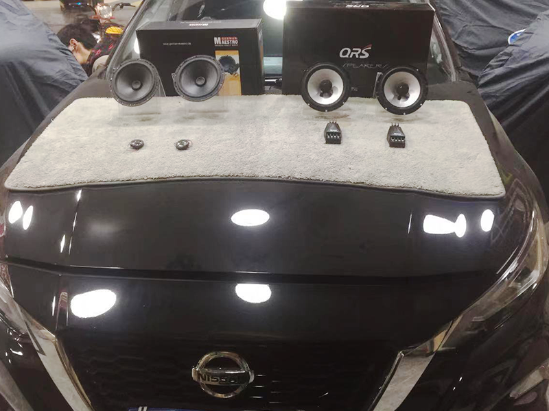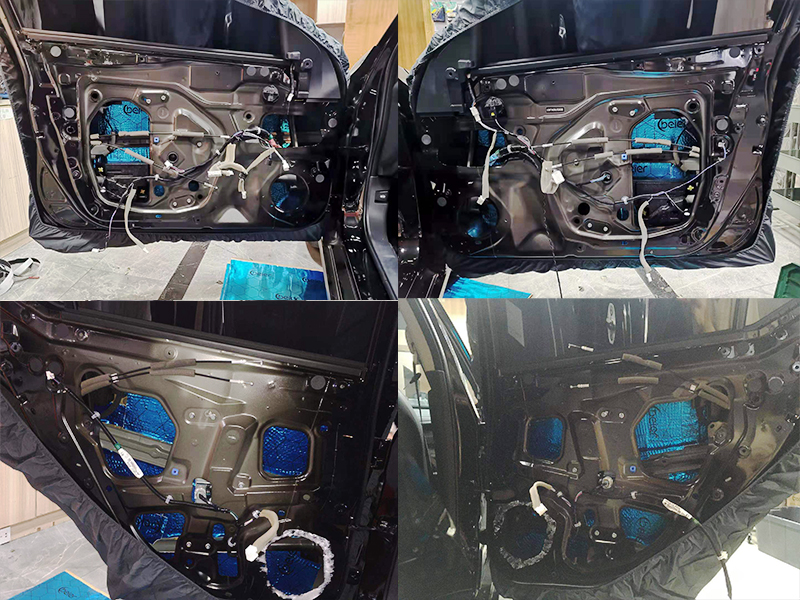 天籟的原車六個喇叭分別在前門兩個中低音,后平臺兩個中低音,前中控左右兩個高音單元。我們先做的是車門的四門隔音。使用的是貝爾的藍膜。第一層是貼合車門板的外壁。增加車門的厚度,減少共振。