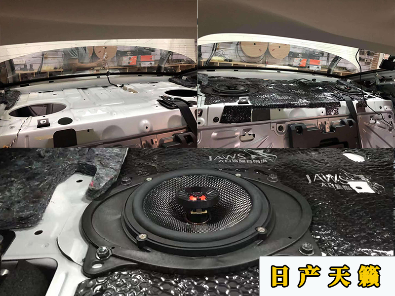 簡單看一下配置,這臺天籟一共是8個(gè)喇叭,前門用的是JBL的套裝喇叭,后門和后平臺用的都是同軸喇叭。加裝的有一臺超薄低音炮,一臺JBL的功放一臺460處理器。另外還有門板的三層隔音