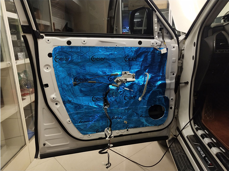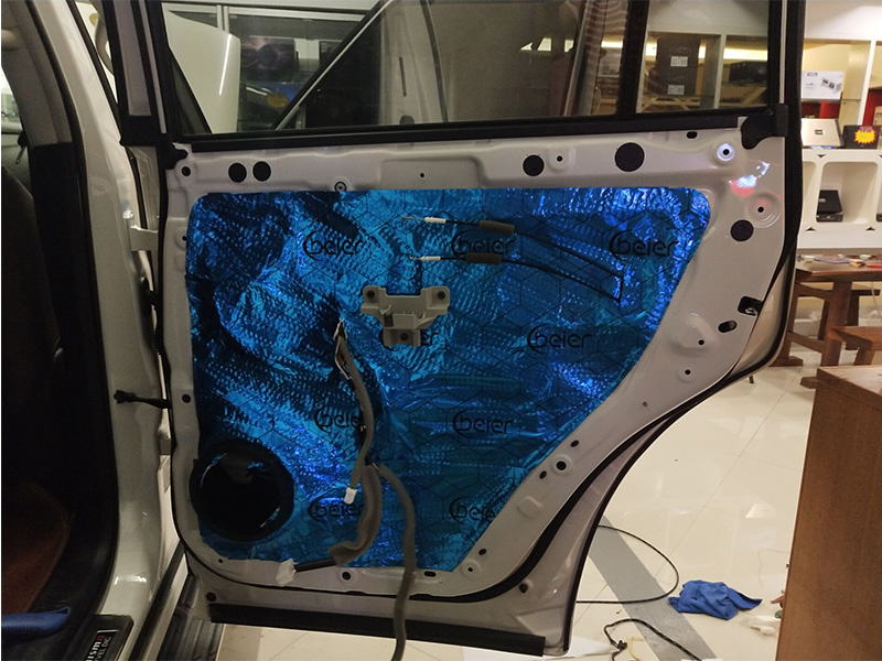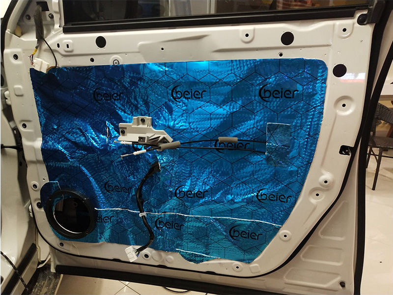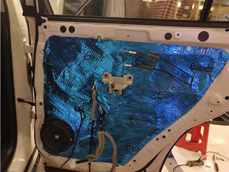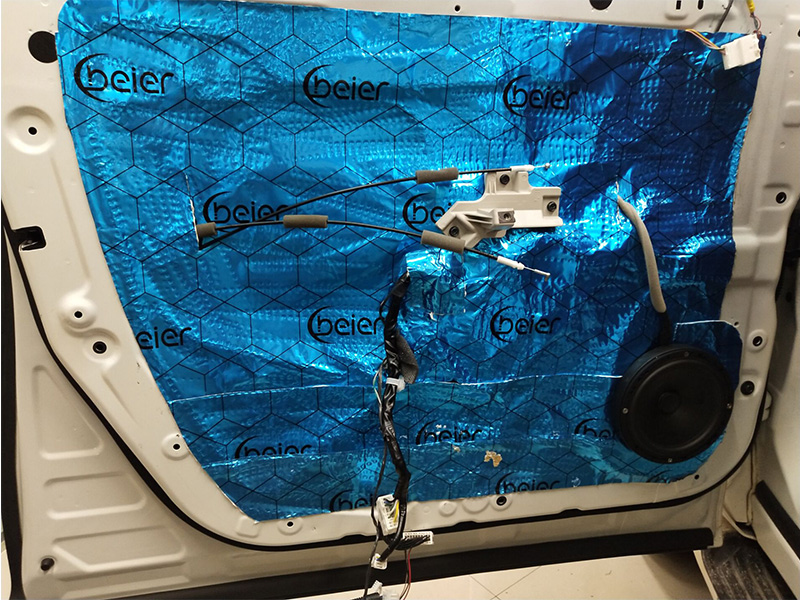 首先進行的是門板位置的隔音升級,技師使用日本中道隔音材料對汽車的門板做三層隔音處理,提升了門板的隔音效果,降低了噪音對車內(nèi)的影響,也為門板上的喇叭提供了個良好的工作環(huán)境。