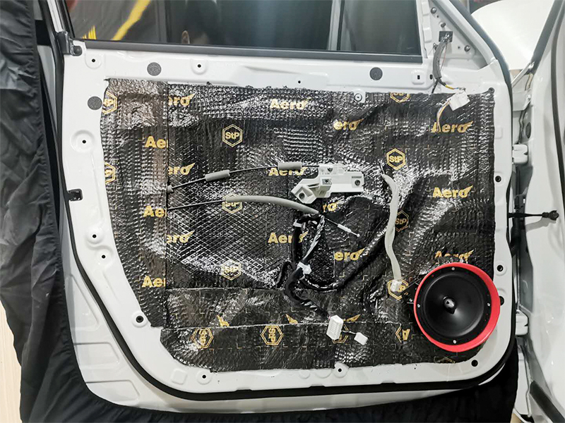把原車的板門雜物處理掉,經(jīng)過專業(yè)的隔音師傅對第一層鈑金進行STP隔音強化鈑金處理后,屬于第一步降低鈑金共振