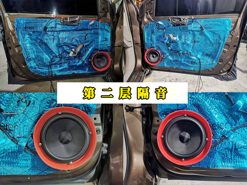 上圖展示的就是第二層隔音貼完之后喇叭的安裝完成圖,第二層的隔音材料和第一層是一樣的,不過就是說第二層是為第一層服務(wù)的,主要就是形成箱體,這樣您的四門車門就如同四個移動的音箱一般,喇叭的安裝上,都是專用的配件,完全不用擔心回過度損耗您的車,畢竟無損升級可不是說著玩的對吧